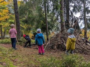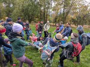Die Familiengruppe verbrachte am 28.09. den Tag mit 10 Erwachsenen und 10 Kindern bei herrlichem Sonnenschein am Kemitzenstein. Einige Kinder begingen gleich mehrmals hintereinander den kleinen aber abenteuerlichen Klettersteig. Das Highlight war das Balancieren über ein Holzbrett in luftiger Höhe. Ein fünfjähriger Kletterneuling war gar nicht mehr vom Seilklettern abzubringen und eine zweijährige baumelte freudig in luftiger Höhe. Auch die Erwachsenen kamen zum Klettern und Picknicken. Zum Abschluss bauten sich die Kinder noch ein Lager im moosbedeckten Wald, welches im Sonnenschein richtig grün leuchtete.