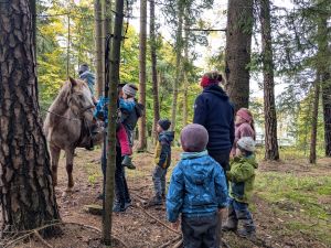 Unsere Familiengruppe wanderte am vergangenen Sonntag mit 24 Kindern und 21 Erwachsenenen (unser neuer Rekord) zur Gänskophütte. Zu Beginn bewiesen alle Eltern ihre Kraft und spannten mit einem 70 m Kletterseil ein Netz, um die Kinder über "die Wiese ist Lava" zu transportieren. Durch den Schamusiwald hindurch ging es bergauf und am Ziel verspeisten wir leckeren Kuchen. Unerwartete Überraschungen gab es auch diesmal wieder, als Pferde unser Waldlager streiften. Ein Reiter hatte sogar ein Lasso dabei und jedes mutige Kind durfte sich auf eines der zwei Pferde setzen. Das hat bei 24 Kindern einige Zeit gebraucht. Danke an die zwei unbekannten Cowboys. Als dann auch noch das Jagdhorn ganz wundervoll durch den Wald erklang, amüsierten wir uns sehr über unseren erlebnisreichen Ausflug durch den Schamusiwald.